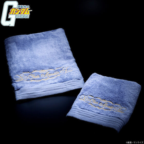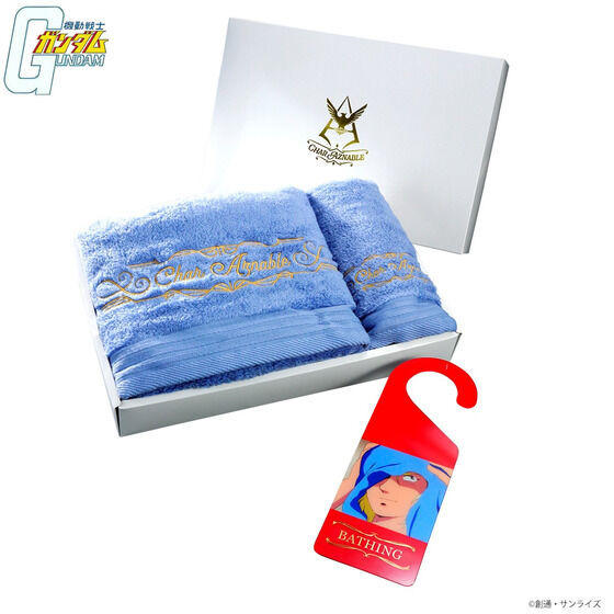 今回発売される「機動戦士ガンダム シャアのタオルセット」は、劇中でシャアが使用しているタオル類をイメージした、バスタオル&フェイスタオルのセット。無撚糸の中でも特に細い糸を使用した、綿本来のやわらかい肌触りが特徴となっている。パイルに艶がある生地に、金糸でオリジナル刺繍が施された。