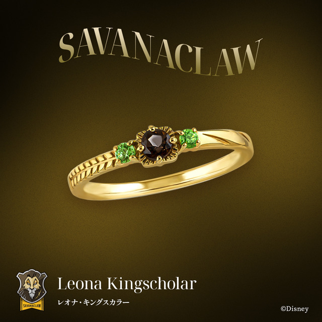 「レオナ・キングスカラー」のリングは、メインストーンにスモーキークォーツを使い彼の髪色を表現。ライオンのたてがみをイメージした石枠にしている。脇石には瞳のカラーをイメージしたグリーンカラーのキュービックジルコニアを留め、レオナらしい色合いに。アームは瞳の傷とサバンナの植物モチーフでアシンメトリーなデザインになっている。
