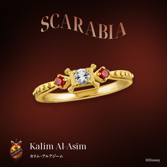 「カリム・アルアジーム」のリングは、メインストーンにはホワイトトパーズを使い彼の髪色を表現。魔法の絨毯をイメージした石枠にしている。脇石には瞳や衣装のカラーをイメージしたレッドカラーのキュービックジルコニアを留め、カリムらしい色合いに。アームはターバンの煌びやかな装飾や模様がデザインされている。