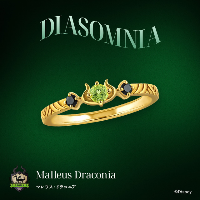 「マレウス・ドラコニア」のリングは、メインストーンにペリドットを使い彼の瞳や衣装の色を表現。ドラゴンの角をイメージした石枠にしている。脇石には衣装のカラーをイメージしたブラックカラーのキュービックジルコニアを留め、マレウスらしい色合いに。アームは糸巻がイメージされている。