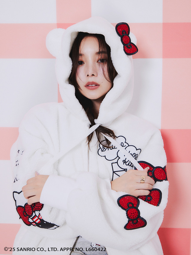 ハローキティのトレードマークであるリボンをテーマにした「ボアパーカー」は、今回のコラボ限定で作成した限定のワッペンやタオル地のようにふわふわした質感の相良刺繍をたっぷりと施して、プレミアムな仕上がりに。袖やフードにあしらったハローキティのリボン部分にはキラキラとしたラインストーンもあしらい、リュクスな印象。背中側にもサガラ刺繍を施し、360度かわいい1着になっている。