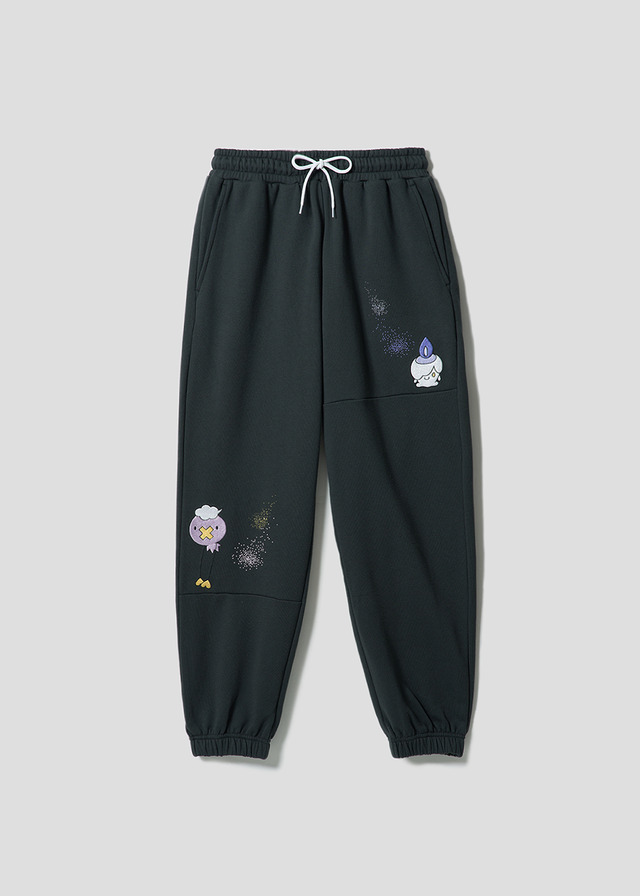 ゴーストタイプのフワンテ、ヒトモシ、ミミッキュを刺繍でデザイン。3匹の周りに漂うカラフルなドットもアクセントになっている。風合いの良い裏毛素材を使用したスウェットパンツ。