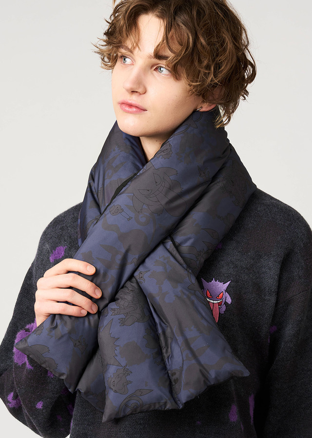 天地逆さにデザインされたピカチュウとミミッキュ、さらにゲンガーやムウマ、ジュペッタなどゴーストタイプのポケモン9種を思わず探してみたくなるリバーシブル仕様の中綿マフラー。首元をしっかりと包み込むボリューム感のあるデザインだが、先端のループ部分に差し込むだけで首に巻くことができる。