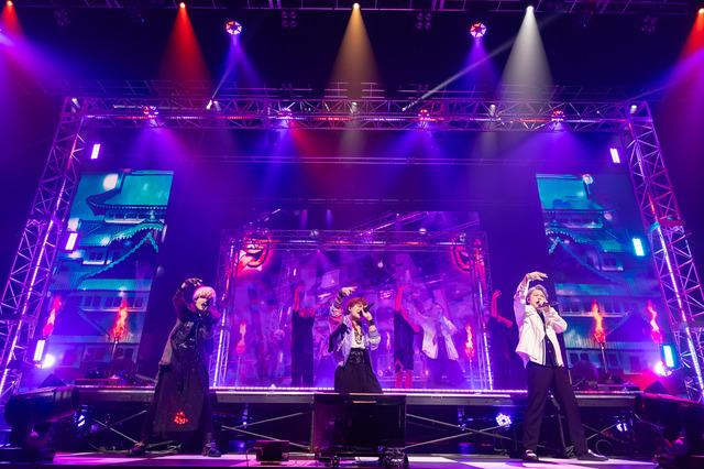 ステージに駆け上がって登場した“Buster Bros!!!”の山田一郎役・木村昴、山田二郎役・石谷春貴、山田三郎役・天崎滉平(崎は「たつさき」)と、“Bad Ass Temple”の波羅夷空却役・葉山翔太、四十物十四役・榊原優希、天国獄役・竹内栄治が位置につき、それぞれのディビジョンハンドサインを決める。すると、間髪を入れず「ヒプノシスマイク -Division Battle Anthem- +」のイントロが爆音で流れ出した。