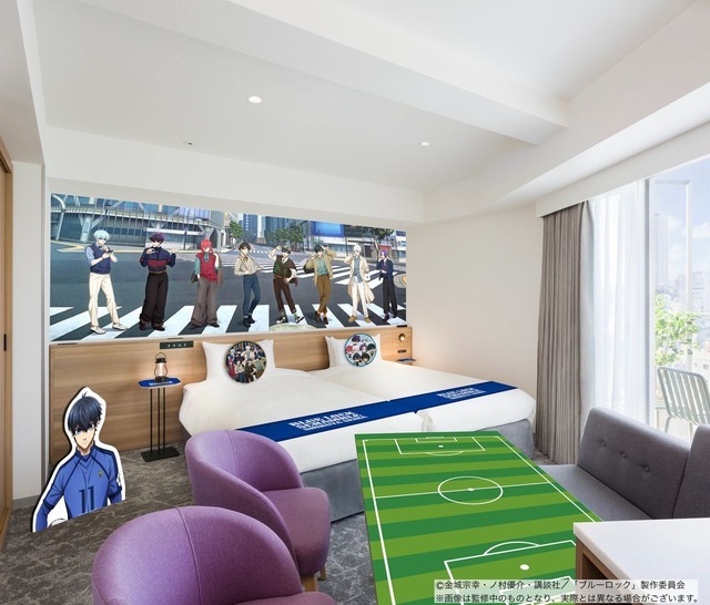 このほか東急ステイ渋谷新南口では、本企画オリジナルの描き下ろしビジュアルなどで世界観を忠実に再現したコラボレーションルームが、10月17日から 1日2室限定で登場する。期間中は、パブリックスペースも『ブルーロック』の世界観で彩られ、1階ロビーにはキャラクターのパネルやフォトスポットが設置される。エントランス階段にもラッピングが施され、ホテルに足を踏み入れた瞬間から『ブルーロック』の世界観に浸れる。
