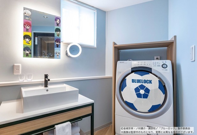 専用テラス付きのデラックスツインルームに用意されるコラボレーションルームは、テラスに人工芝が敷き詰められた、サッカーフィールドをイメージしたもの。内装は『ブルーロック』の人気キャラクターに囲まれた空間が広がり、室内に設置された洗濯乾燥機のドアにもサッカーボールのイラストが施されるなど、世界観を存分に味わえるコンセプトルームとなる。