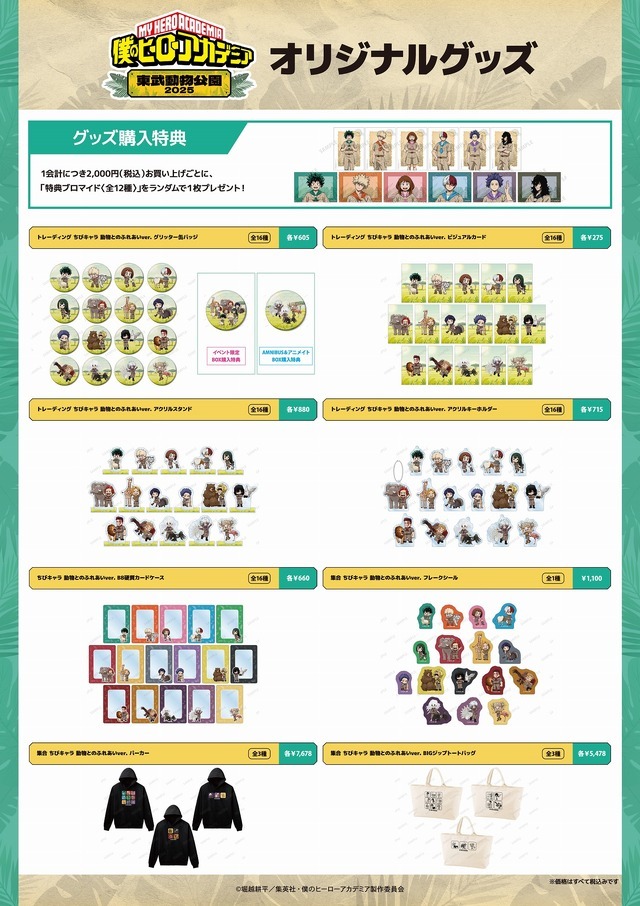 コラボイベント「TVアニメ『僕のヒーローアカデミア』×東武動物公園2025」では、POP UP SHOPにて描き下ろしビジュアルやちびキャラを用いたグッズを販売。缶バッジ、アクリルスタンド、クリアファイルなどの定番アイテムに加えて、コラボを記念したお土産せんべいやトートバッグなどもラインアップする。