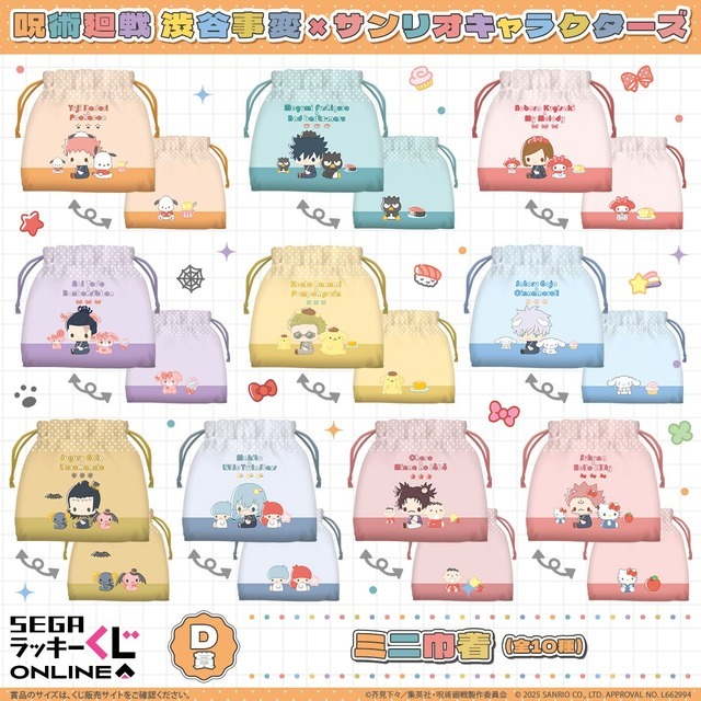 2頭身になった虎杖悠仁たちとサンリオキャラクターズの組み合わせは、とってもキュート。賞品も大胆デザインのA賞「フェイスポシェット」、座った姿は見てるだけで癒されそうなB賞「おすわりぬいぐるみ」など、かわいさがあふれるアイテムがラインナップされている。