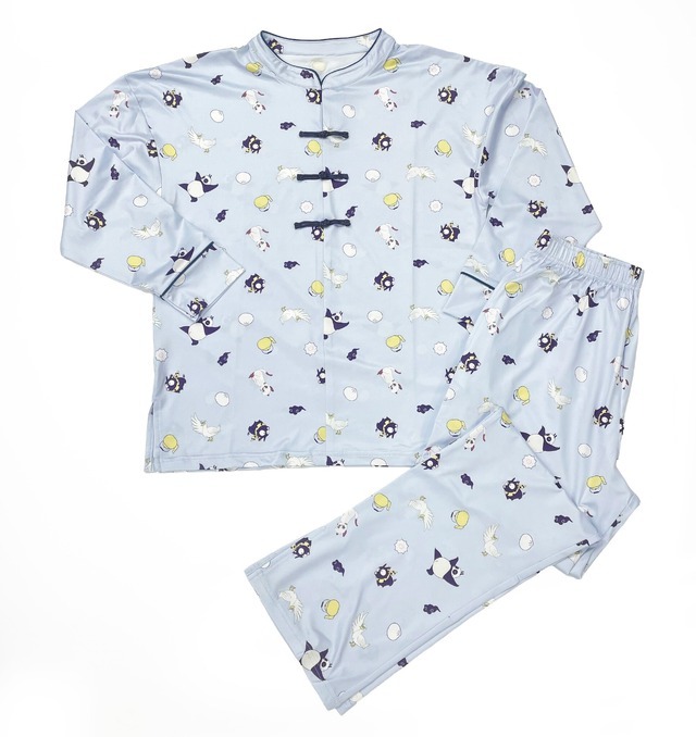 「レディースルームウエア」は、玄馬(パンダ)やPちゃん、シャンプー(猫)、ムース(アヒル)に、ヤカンや小籠包といったユーモアあふれるモチーフの総柄生地が使用された、ハッピーなデザインの一着だ。カンフー着のようなスタンドカラーに、チャイナ釦風の飾りがアクセントとなっている。なめらかな肌触りで伸縮性がある素材のため、オールシーズン着用できる。