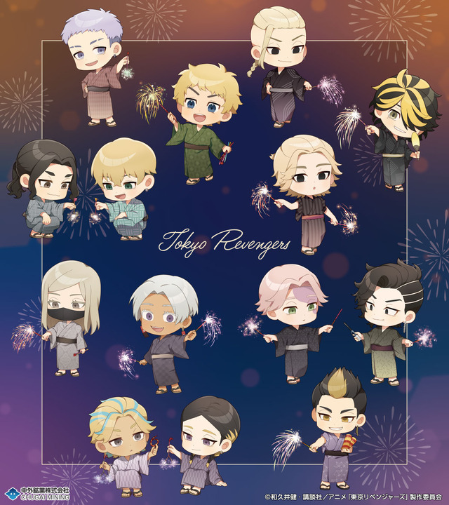 浴衣に着替え、夜空に咲く花火を眺めながら夏を満喫する花垣武道、佐野万次郎、場地圭介、松野千冬、三途春千夜、灰谷蘭、灰谷竜胆、黒川イザナ、鶴蝶たち9人のイラストや、武道たち14人のミニキャラver.のイラストがあしらわれている。