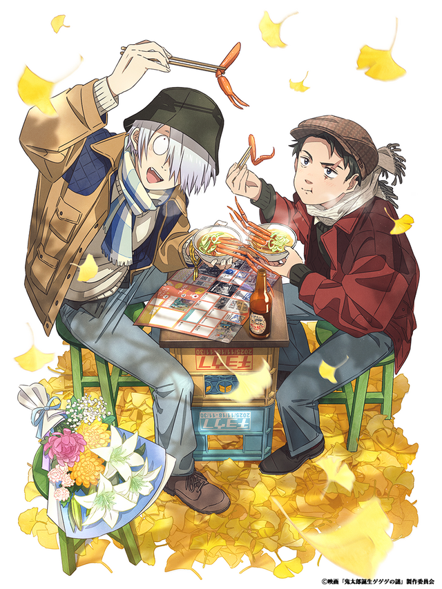 映画『鬼太郎誕生 ゲゲゲの謎』のキャラクターデザインを担当した谷田部透湖氏描き下ろしイラストも公開。秋の装いを纏った鬼太郎の父と水木がゲゲゲ忌でカニ汁やスタンプラリーを満喫する姿が描かれており、「ゲゲゲ忌2025」ならではのイラストになっている。