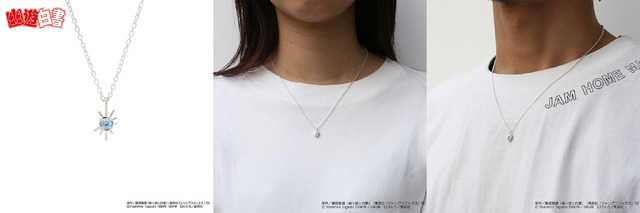 浦飯幽助の十八番の必殺技、指先に霊気を集中し心を引き金にして放つ弾丸「霊丸」をイメージし、発射直前の霊気が収束している瞬間を天然石のブルートパーズとシルバーの台座で表現した「浦飯幽助 霊丸ネックレス」など6アイテムだ。