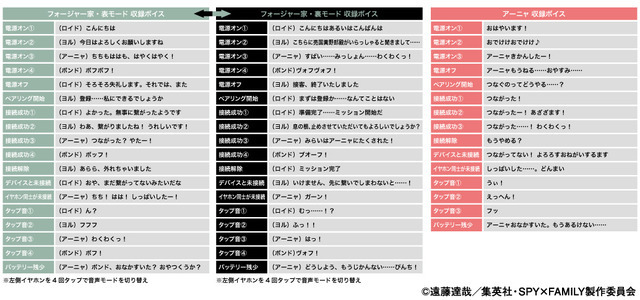 「フォージャー家」モデルでは、フォージャー家の新規録り下ろし掛け合いボイスを搭載。しかも左側イヤホンを4回タップすることで「表モード」「裏モード」と音声モードを切り替えることが可能だ(各18ワード)。収録ボイスの一例を紹介しよう。