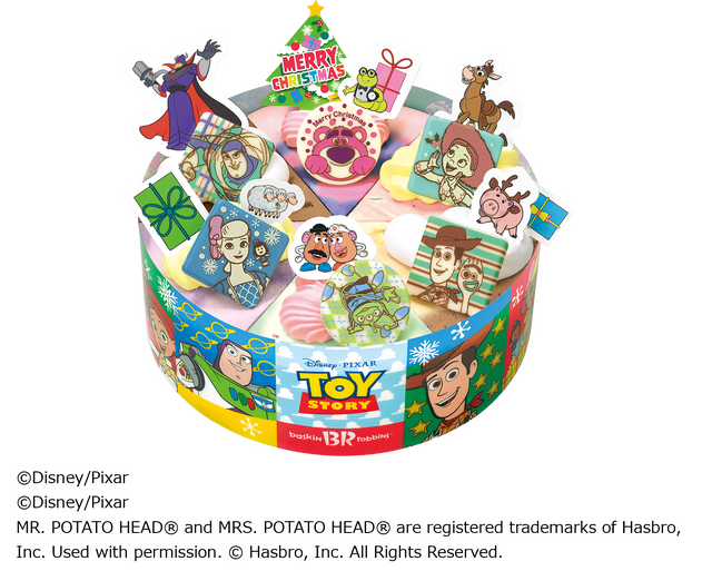 今年30周年を迎えたトイ・ストーリーの「プレゼントボックス」をテーマにした特別なクリスマスケーキは、サーティワンのアイスクリームケーキでは初めてロッツォと元気いっぱいのカウガール ジェシーが仲間入り。プレゼントのリボンをイメージしたホイップクリームでデコレーションし、カラフルなチョコレートになったウッディやバズたちがにぎやかに彩る。イチゴの香りのするロッツォのピースは「コットンキャンディ」とストロベリーのフレーバーにするなど、キャラクターのイメージで人気のラインナップが選ばれた。台紙にはオーナメントやプレゼントをちりばめ、作品中でアンディの誕生日プレゼントを偵察するグリーンアーミーメンをプラス。彼らがクリスマスプレゼントを偵察しているような遊び心満載のデザインとなっている。フィルムにはトイ・ストーリー1~4までの人気キャラクターが描かれた。
