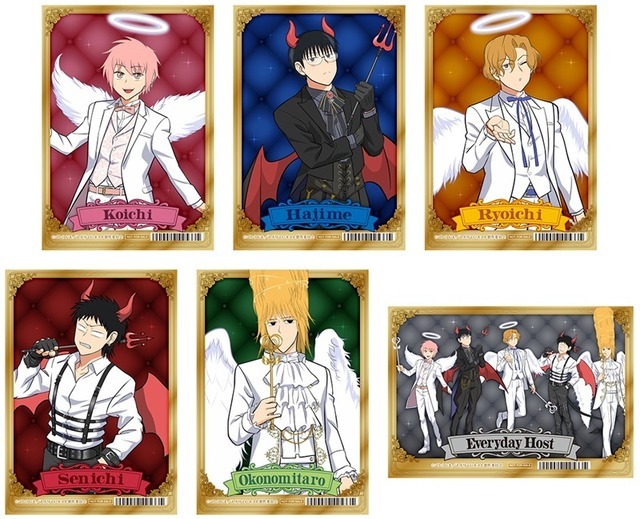 『えぶりでいホスト』アニメイトオンリーショップ~天使と悪魔が贈るHAPPEY NIGHT~がアニメイト新宿にて2026年1月17日~2月1日まで開催される。天使や悪魔風の衣装を身につけたコーイチ、ハジメ、リョーイチ、センイチ、おこのみ太郎のアクリルスタンド、アクリルステッキなどが登場する。