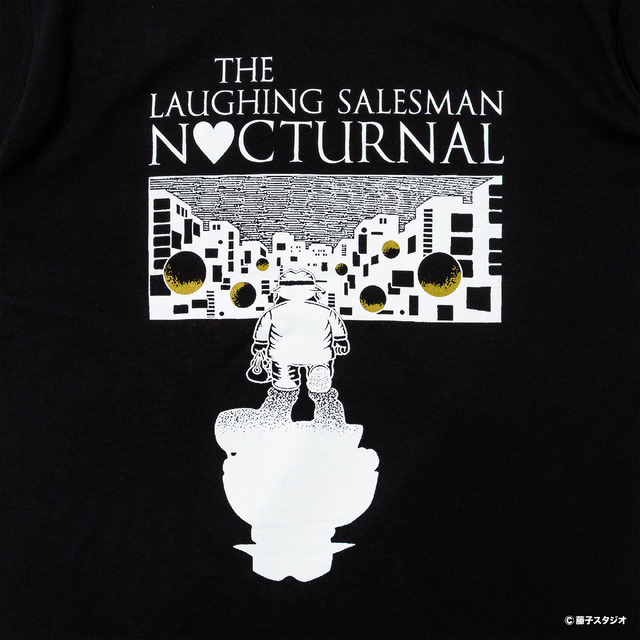 「Nocturnal 笑ゥせぇるすまん THE LAUGHING SALESMAN Tee(Black)」は、無機質な街の光の中を、喪黒福造が静かに歩く。モノトーンに落とし込まれたグラフィックの中に光の彩色で夜の街に漂う欲望を表現。