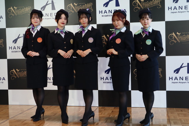 記者会見冒頭に、CA衣装をまとって登場した相羽、工藤、中島、櫻川、志崎の5人。今まで着たことがないCAの衣装について聞かれると工藤は胸元のワッペンに注目し、それぞれのキャラクターのイメージカラーになっていると語った。