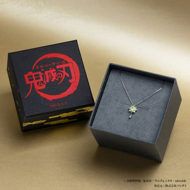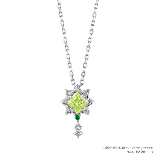 「シルバーネックレス(不死川実弥)」は、鍔をイメージしたフォルムにグリーンの石をセッティングした。中央には大ぶりでシャープなスクエアの石を使用し、荒々しさと風の呼吸の鋭さを表現。下には羽織や髪色をイメージしたクリアな石が揺れてきらめき、裏側には胸の大きな傷を刻んだ。