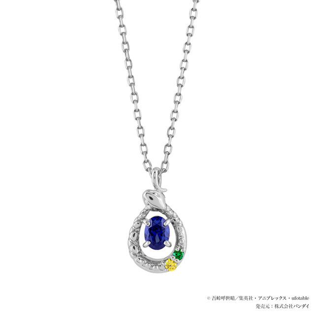 「シルバーネックレス(伊黒小芭内)」は、伊黒小芭内をイメージして、青紫の石を蛇が取り巻くようにデザイン。鍔(つば)の形を思わせるオーバルの石が中央で深い輝きを放ち、蛇の背に留められたイエローとグリーンの石で特徴的なオッドアイを表現している。中央の石の裏側には羽織をイメージした縞模様を刻んだ。