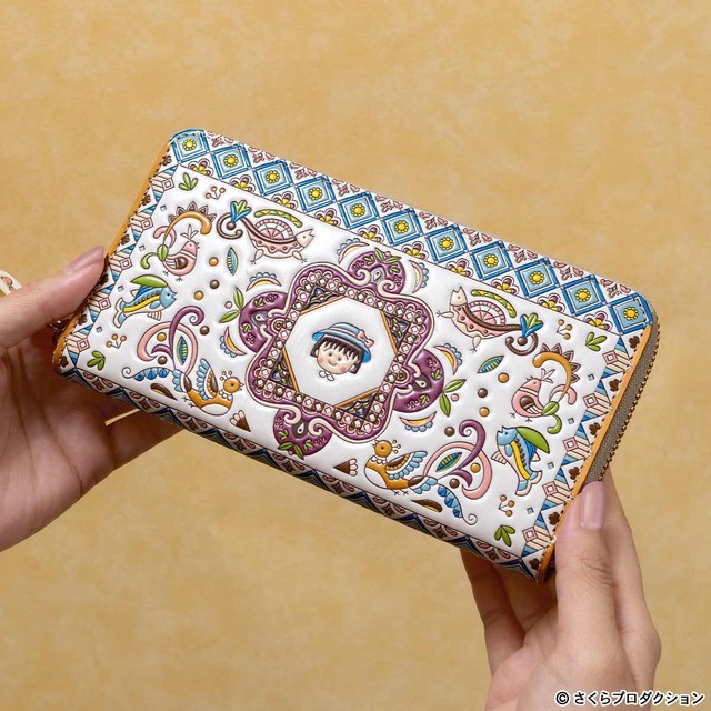 白くなめらかな播州特産の牛革に浮かび上がる『ちびまる子ちゃん』の世界観が見事にデザインされている。中央に帽子を被っておめかしをしたまるちゃん、その周りに小鳥や魚、トカゲなど個性豊かないきものと植物が散りばめられた。