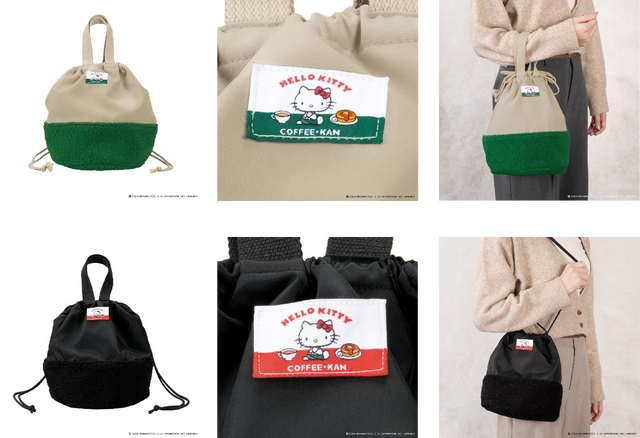 冬にぴったりの、もこもことしたボア素材と軽やかなナイロン素材を組み合わせた「ボア巾着バッグ」は、 カラーバリエーションは、どんなコーディネートにも合わせやすいブラックとベージュの2色展開。巾着ならではの丸みのあるフォルムが上品で愛らしく、紐を引くだけで簡単に開け閉めが可能。紐を長くして肩にかければショルダーバッグとして、持ち手部分に腕を通せばハンドバッグとして、気分やシーンに合わせて2WAYで使うことができる。コンパクトな見た目ながら底マチがあるため、収納力も抜群。バッグの中央には、1970年代のデビュー当時のハローキティのデザインをベースに、珈琲館の世界観を取り入れたネームタグをステッチ。珈琲館の制服を着たハローキティと珈琲館の看板商品「トラディショナル・ホットケーキ」があしらわれた。