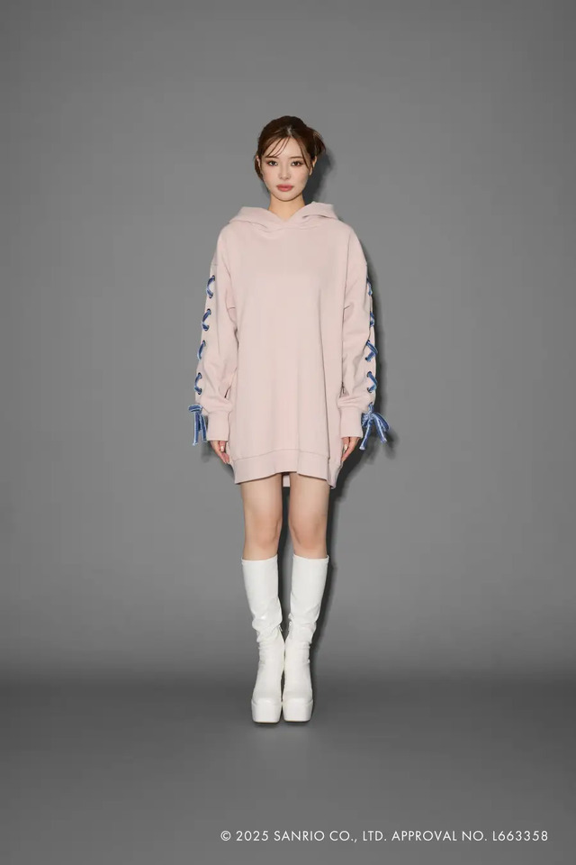 「マイメロディスウェットミニワンピース」は、マイメロディをイメージしたやさしいピンク色のワンピース。ブルーのリボンやワンポイントがアクセントになっていて、背面の裾部分にはふわふわのしっぽがデザインされている。