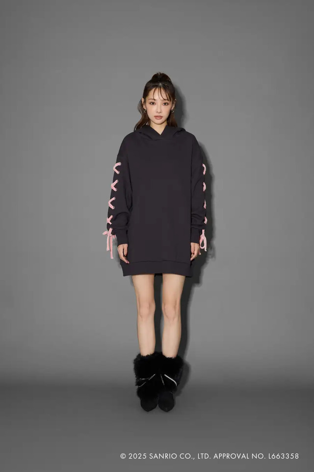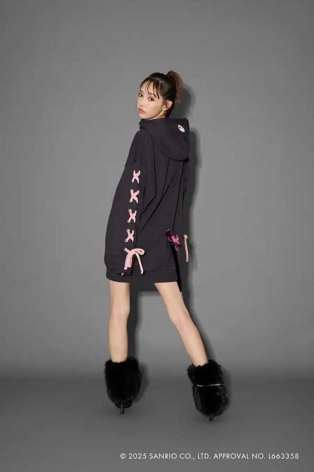 「クロミスウェットミニワンピース」は、クロミをイメージした黒とピンクのワンピース。フードについたドクロマークや、クロミのしっぽに見立てたリボンがワンポイントになっている。