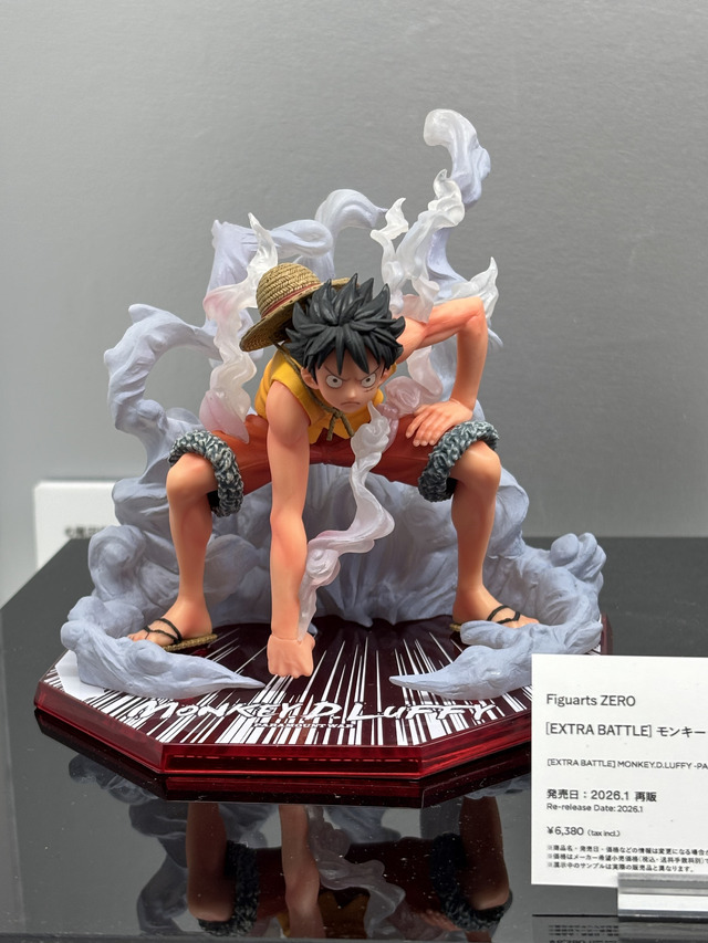 ルフィとエースのフィギュアは、可動域の広さを活かしたポージングと、燃え上がるエフェクトパーツが相まって、とにかく画になる展示。兄弟の力強さがそのまま立体化されたようだった。また、水転写プリントで色柄が一体ごとに異なる“アートルフィ”がずらりと並び、技術実験展示としても非常に見応えがある仕上がり。フィギュアの可能性を強く感じるコーナーだった。