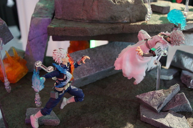 『僕のヒーローアカデミア』エリアは、巨大な瓦礫ジオラマを使った“全面バトル展示”が圧巻。デクや爆豪、轟らがエフェクトをまとい、壊れた岩肌の上でヴィランと激突する迫力のシーンが再現されていた。躍動感あふれるポージングや緑と赤のライティングで、原作の頂上決戦がそのまま立体化したような臨場感に。単体展示のトガや変身デクも存在感が強く、シリーズの進化を感じさせるラインナップだった。