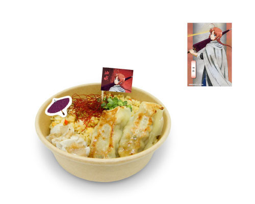 「銀時のみたらし団子パフェ」「新八と神楽の彩りクラッシュゼリーソーダ」「神威の寿司桶風ミニ餃子飯」「阿伏兎のハンバーグ&あらびきウィンナーホットドッグ」「月詠の『百華』ラーメン」など、気になるメニューがたくさん。
