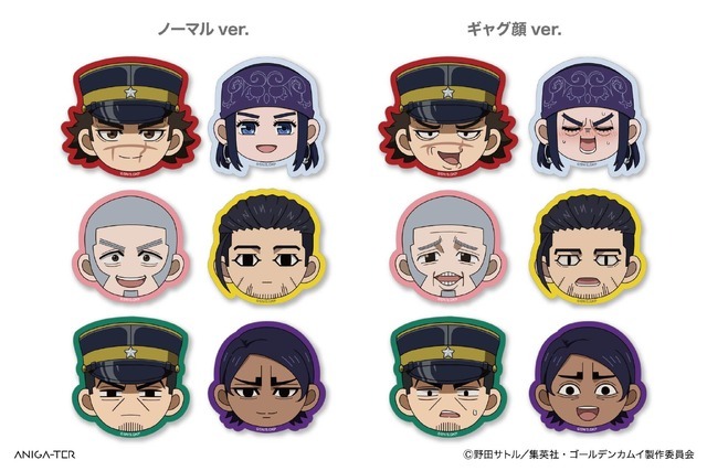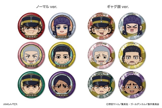デフォルメ缶バッジは杉元佐一、アシ(リ)パ、白石由竹、尾形百之助、月島軍曹、鯉登少尉の「ノーマルver.」、「ギャグ顔ver.」の描き起こしイラストを使用した合計12種展開。ランダムと12種コンプリートセットが販売される。