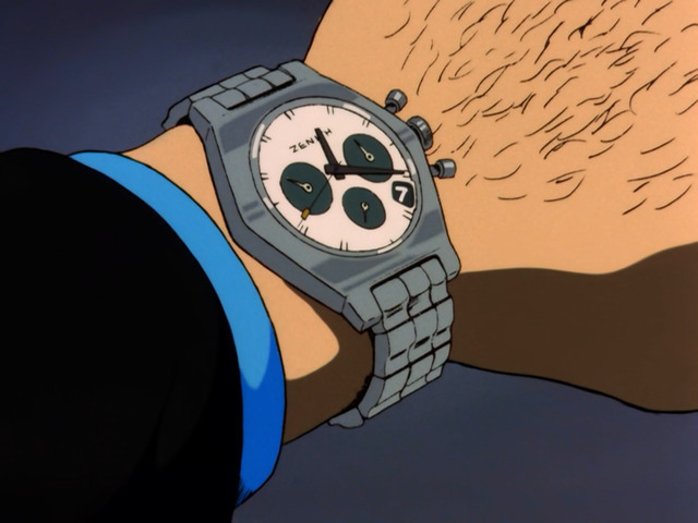 次元はアニメの中で、2度にわたりゼニスの時計を着用している姿で描かれた。その時計は明らかに「A384」をモデルとしているが、アニメーターによる創作であり実際には存在しないものだった。興味深いことに、初回はブラックの文字盤、2度目はシルバーの文字盤で登場していた。
