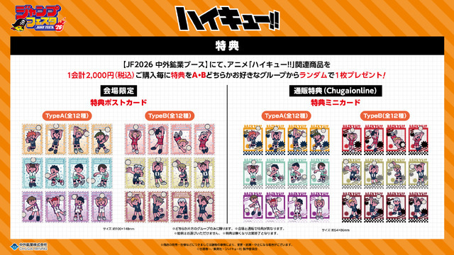 ジャンフェス会場内「中外鉱業ブース」にて1会計2,000円(税込)購入毎に、特典ポストカードA(全12種)・B(全12種)どちらか好きなグループからランダムで1枚プレゼントされる。