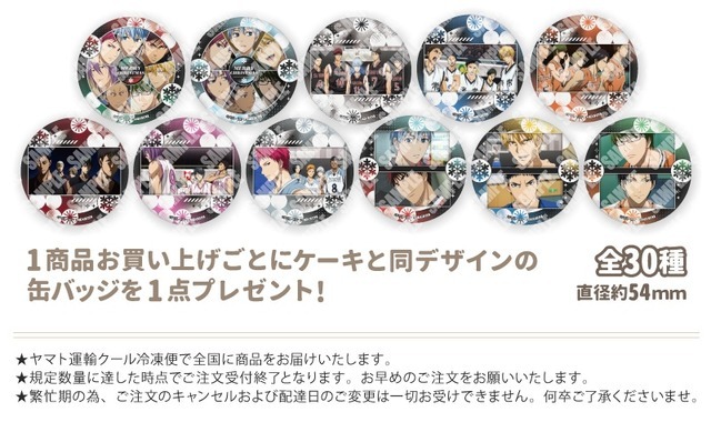 購入したケーキと同じデザインの缶バッジを、ケーキ1点を購入ごとに1つもらえる。見ても食べても美味しい、推しキャラクターで彩られたケーキとともに楽しいクリスマスを過ごしたい。