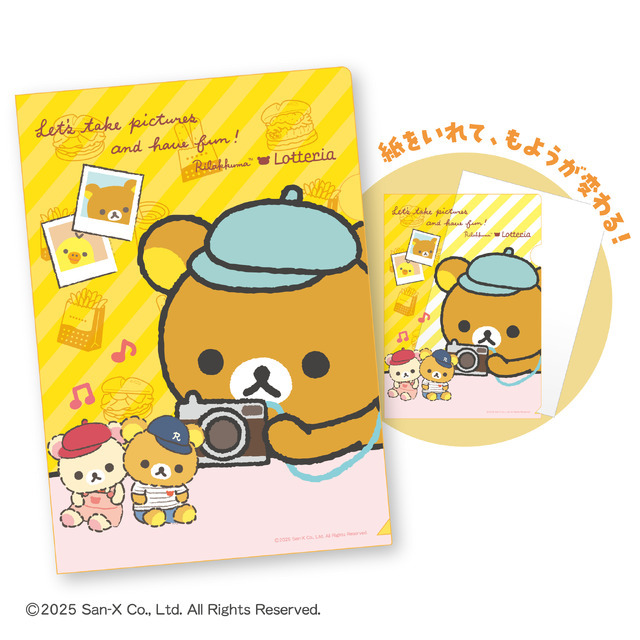 ぬいぐるみの写真を撮影するカメラマン風リラックマの可愛いイラストが描かれた「マジッククリアファイル」は、中に紙などを入れると色や柄が透けて、ファイルの模様が変化する仕様だ。