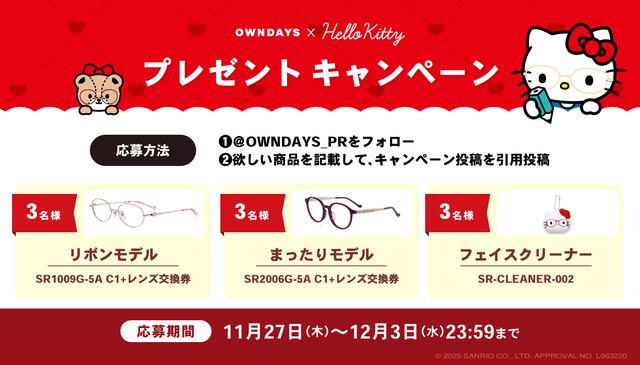 さらに、ハローキティとのコレクション発売を記念した、Xプレゼントキャンペーンも実施。OWNDAYS公式アカウントをフォローし「ご希望の商品」を記載のうえ、対象の投稿を引用すると応募完了。抽選で合計9名に、指定のコラボ商品がプレゼントされる。