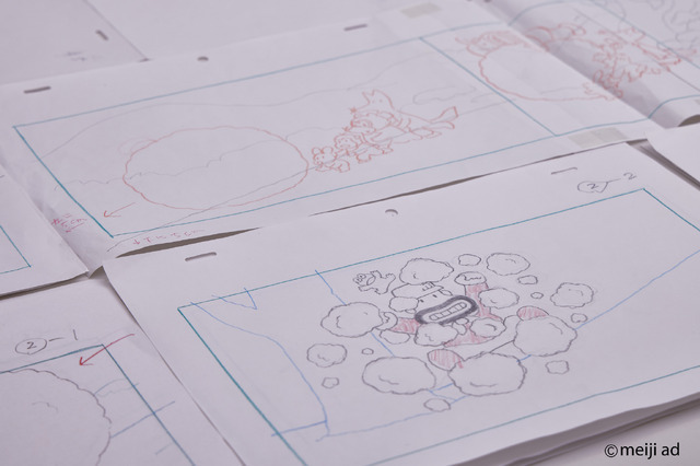 今回の「雪だるま」篇では、動きのキーとなるポーズを描いた原画が161枚にものぼった。これについて、ひこねは「雪だるま篇の制作では、カールおじさんが雪のかたまりに巻き込まれるところが一番大変でした。また、一番こだわったのは雪が樹にぶつかってアールおじさんが現れるところです」と語る。その動きの複雑さを、違和感なくスムーズなアニメーションで表現するためには、多数の原画が必要となったそうだ。