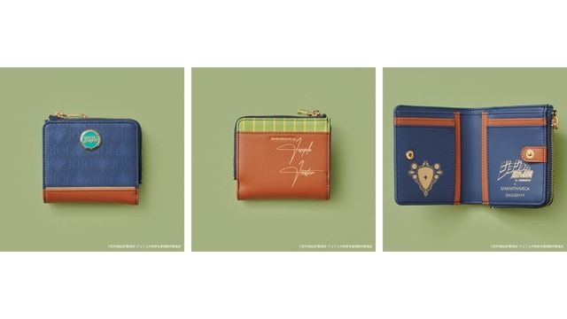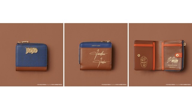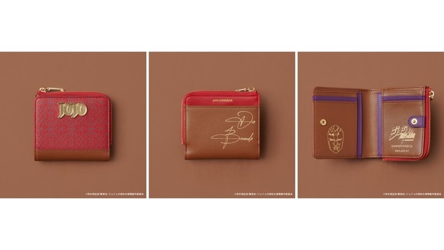 バッグのデザインとリンクした折財布は、裏面に「ジョナサン・ジョースター」のサインをプリント。スナップボタンを開くと、物語のキーアイテムである「石仮面」のアートとタイトルが箔押しでデザインされているなど、細部にまでこだわったアイテムだ。