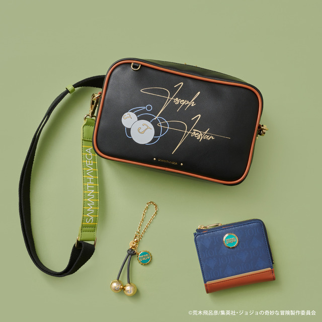 物語の舞台であるイギリスの雰囲気を取り入れ、キャラクターのモチーフや衣装のイメージをデザインに落とし込んだアイテム。バッグと折財布全体には、ジョースター家の壁紙の模様が総柄でデザインされている。