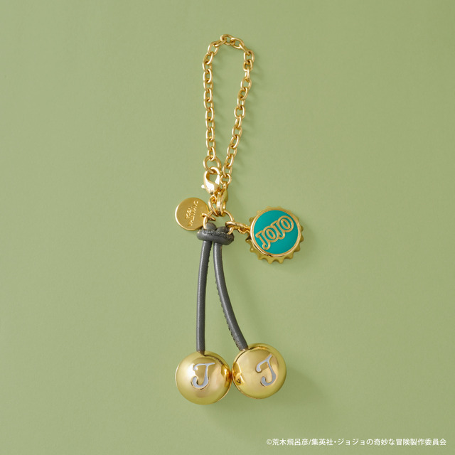 バッグチャームは「ジョセフ・ジョースター」がクラッカーヴォレイで使用するアメリカンクラッカーを立体的に表現。物語に登場する瓶の蓋を金具に落とし込んだモチーフもポイントで、チェーン部分を外してファスナーチャームとしても使用できる。