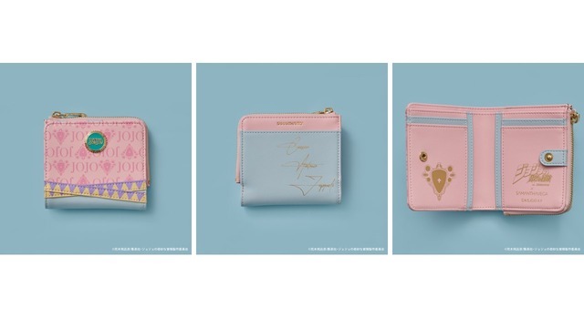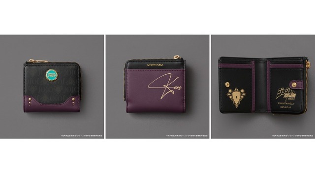 バッグのデザインとリンクした折財布は“JOJO”と「エイジャの赤石」の総柄で、オリジナル金具のデザインには物語に出てくる瓶の蓋が落とし込まれている。両サイドにはカーズのイヤリングをイメージしたモチーフをデザインし、裏面には「カーズ」のサインがプリントされている。スナップボタンを開くと、物語のキーアイテムである「エイジャの赤石」のアートと、タイトルが箔押しでデザインされているなど、細部にまでこだわったアイテムだ。
