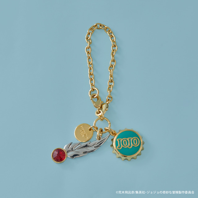 バッグチャームのモチーフは、「シーザー・A・ツェペリ」のバンダナについた羽のアクセサリー。また、物語に登場する瓶の蓋を金具に落とし込んだモチーフもポイントで、チェーン部分を外してファスナーチャームとしても使用できる。