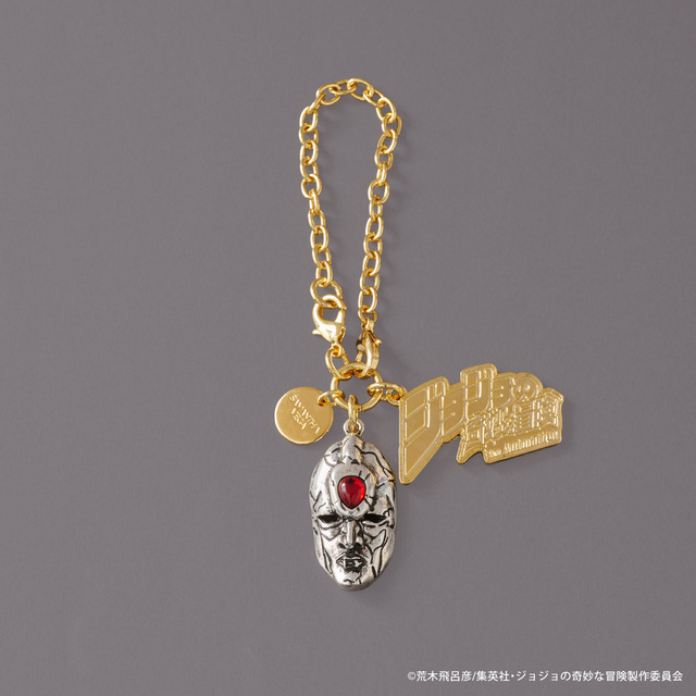 「ジョナサン・ジョースター」が研究していた謎の仮面で、物語のキーアイテムである「石仮面」を金具に落とし込んだバッグチャームは、タイトルロゴの金具プレートに印象的なカタカナロゴを使用。チェーン部分を外してファスナーチャームとしても使用できる。
