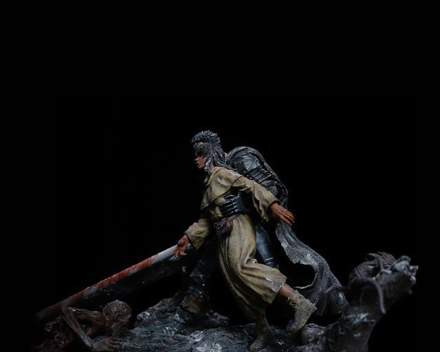 ガッツは襲い掛かるモンスターたちを斬り捨て、キャスカを守ろうとする。それと裏腹に記憶の無いキャスカは、獣の如く奮戦し段々と獣の心に飲み込まれそうになるガッツを恐れ、不信感を募らせていく。かつて想いを重ねた2人の気持ちは、寄り添うように歩いていても今は噛み合わない。交わることのない2人の想いや背景が、視線ひとつで表現された造形が見どころだ。