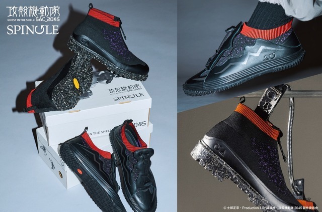 うちローカットタイプの「SP-SAC_2045-A」は、SPINGLEの人気ミッドカットモデル「SP-442」の2045年の姿と『攻殻機動隊SAC_2045』の主人公・草薙素子の衣装を融合させたデザインだ。アッパーは裁断時に無駄が出にくいニット素材で、アウトソールは植物繊維のセルロースナノファイバー(CNF)を混合した、摩耗に強い自社製のアウトソール「RUBEAR CNFソール」を使用している。SPINGLEが得意とする、熱と圧力を用いてアッパーとソールを圧着するバルカナイズ製法で製造されているのも見どころだ。