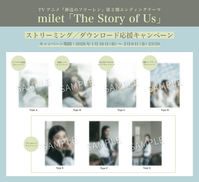 本作には、1月16日(金)から放送開始となるTVアニメ「葬送のフリーレン」第2期のエンディングテーマ「The Story of Us」を収録。さらに新曲「Trace」や、ピアノ/ギター&チェロによる新アレンジで制作し、miletのヴォーカルを再録音したTVアニメ第1期エンディングテーマの別アレンジ曲「Anytime Anywhere - Piano Session」「Anytime Anywhere - A.Gt Session」などが収録されています。