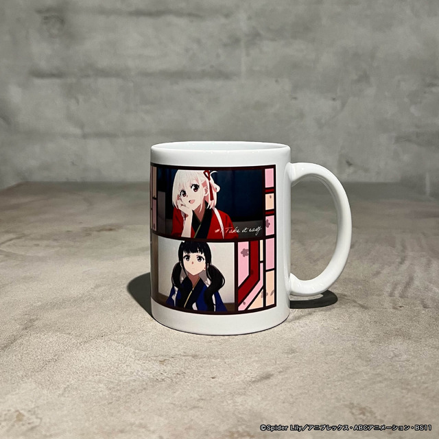 全6種のマグカップは、オリジナルショートムービーより、各話の場面写をあしらったデザイン。対になるアクリルコースターとセットで並べれば、リコリコの世界が広がる。