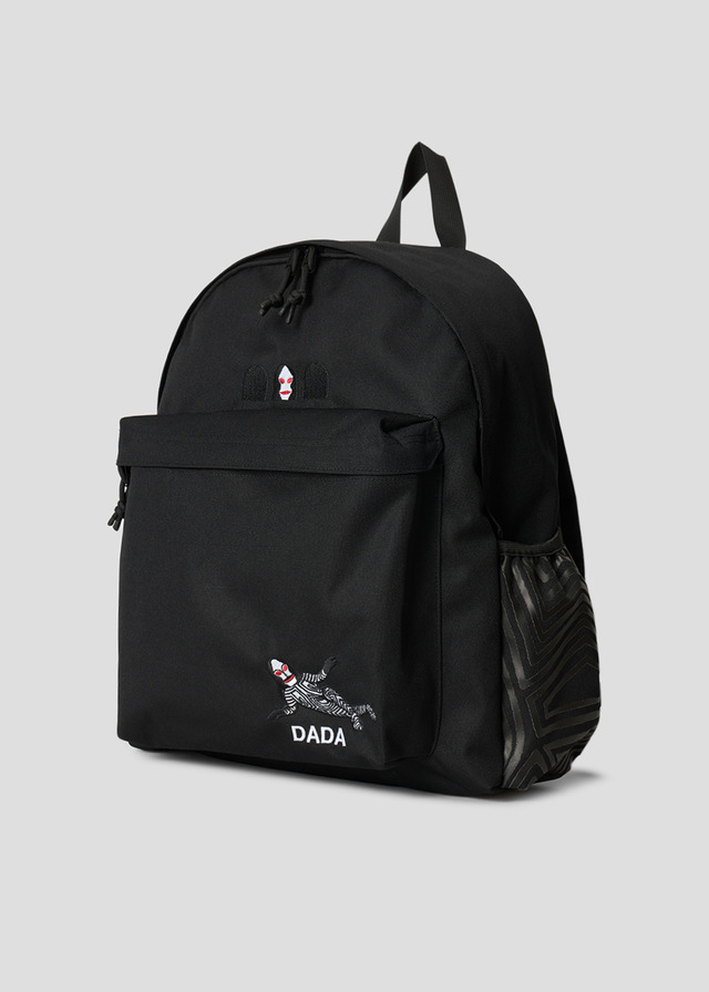 フロントにはダダの顔を刺繍で表現し、ポケットには横たわるダダと「DADA」のロゴを刺繍であしらったデザイン。内側とサイドポケットには、ダダの体の模様をプリントがしてある。