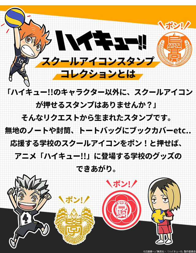 アニメ『ハイキュー!!』に登場する学校のマークをポン!と押して楽しめる「ハイキュー!! スクールアイコンスタンプコレクション」が登場。インターネットのはんこ屋さん「印鑑はんこSHOPハンコズ」のオンラインショップにて販売が開始された。