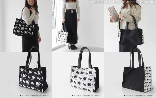 デザインは選べる3種類。柄がしっかり浮かび上がり自己主張したい人向けの黒ベース、よく見るとハローキティと分かる遊び心溢れるデザインが好みの人向けの白ベース、シーンを選ばず使える最もシックで万能な黒無地がラインナップされている。